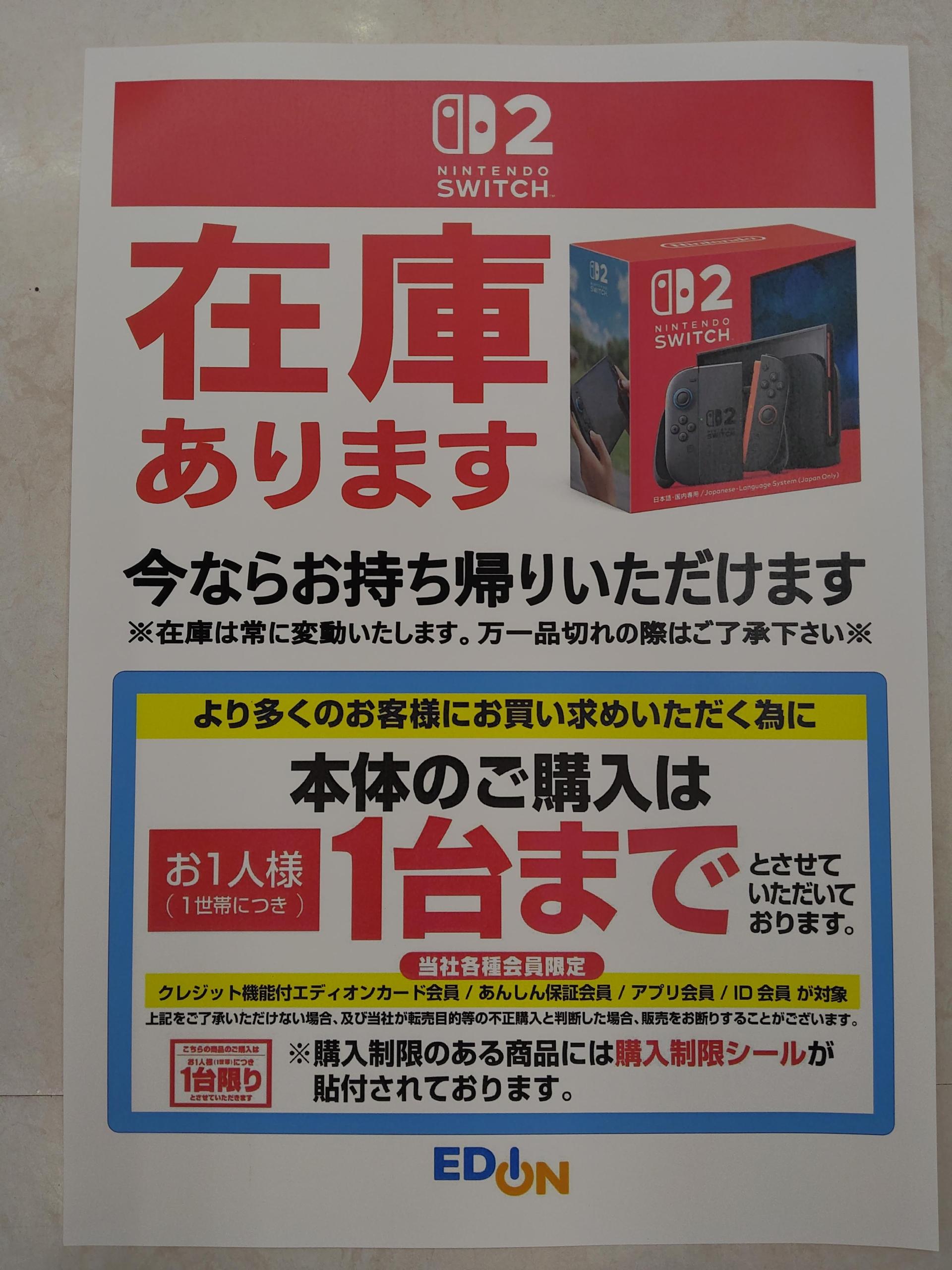 大人気のニンテンドースイッチ2在庫あります! エディオン